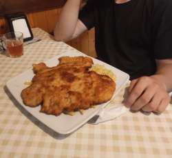 Faktycznie schabowy gigant jest wielki i z tego co mówił syn pyszny więc wciągnął go nosem na raz przejadł frytkami i surówką i musiał dobić golfem z nutellą. My jedliśmy dorsza klasycznego oraz z grzybami i mozzarellą bardzo dobry i jak na dzisiejsze czasy przystępna cena czas czekania bardzo krótki. Wszystkie dania świeże i apetycznie podane, pozdrawiam